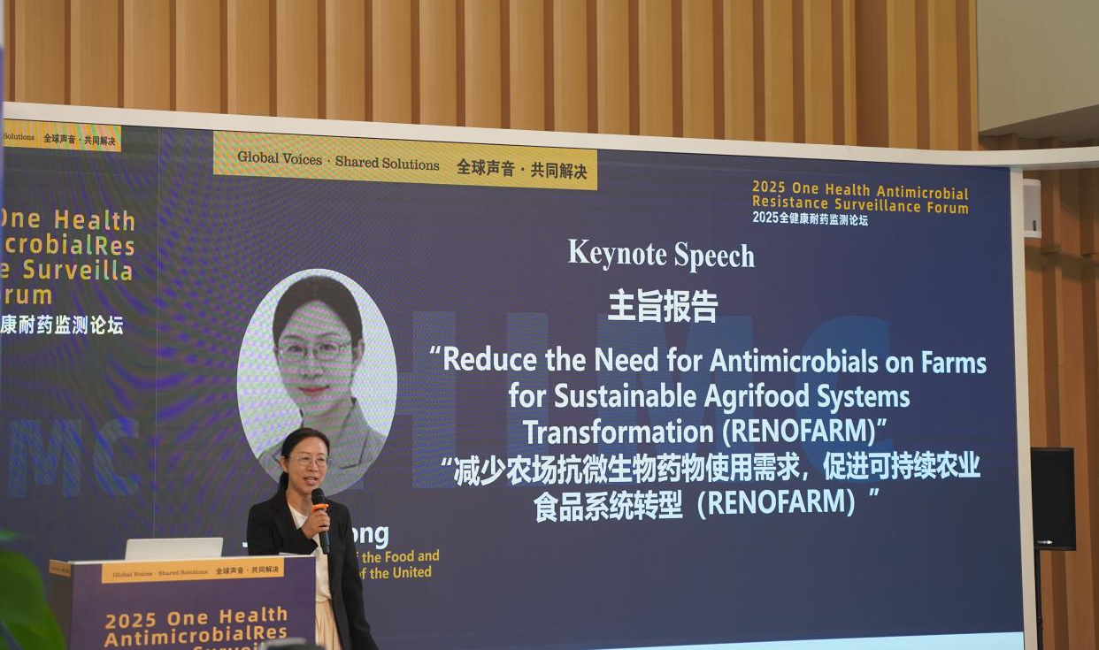 联合国粮农组织全健康办公室宋俊霞处长作了题为“Reduce the Need for Antimicrobials on Farms for Sustainable Agrifood Systems Transformation(减少农场抗微生物药物使用需求,促进可持续农业食品系统转型)”的主旨报告。宋处长披露:农业领域抗微生物药物滥用已构成全球性危机,若不加以干预,2050年AMR将致千万人死亡并造成3.5万亿美元的年损失。为了支持农场层面的工作,联合国粮农组织正式启动"重塑农场倡议"框架,其中,五“好”措施是核心:即良好卫生服务、良好生产实践、良好替代方案、良好连接和良好激励。该倡议目前已在多国试点,如印度尼西亚和非洲的尼日利亚和乌干达等,同时在中国也举办了首届“重塑农场”全球决议,聚焦国家层面行动。